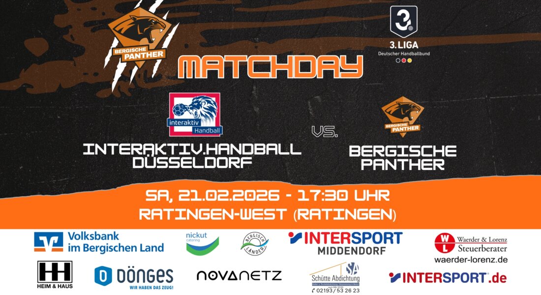 Für unsere Panther steht am Samstag, den 21.02.2026, das nächste Auswärtsspiel auf dem Plan. Um 17:30 Uhr ist unsere 1. Herren in Ratingen bei Interaktiv.Handball Düsseldorf zu Gast.