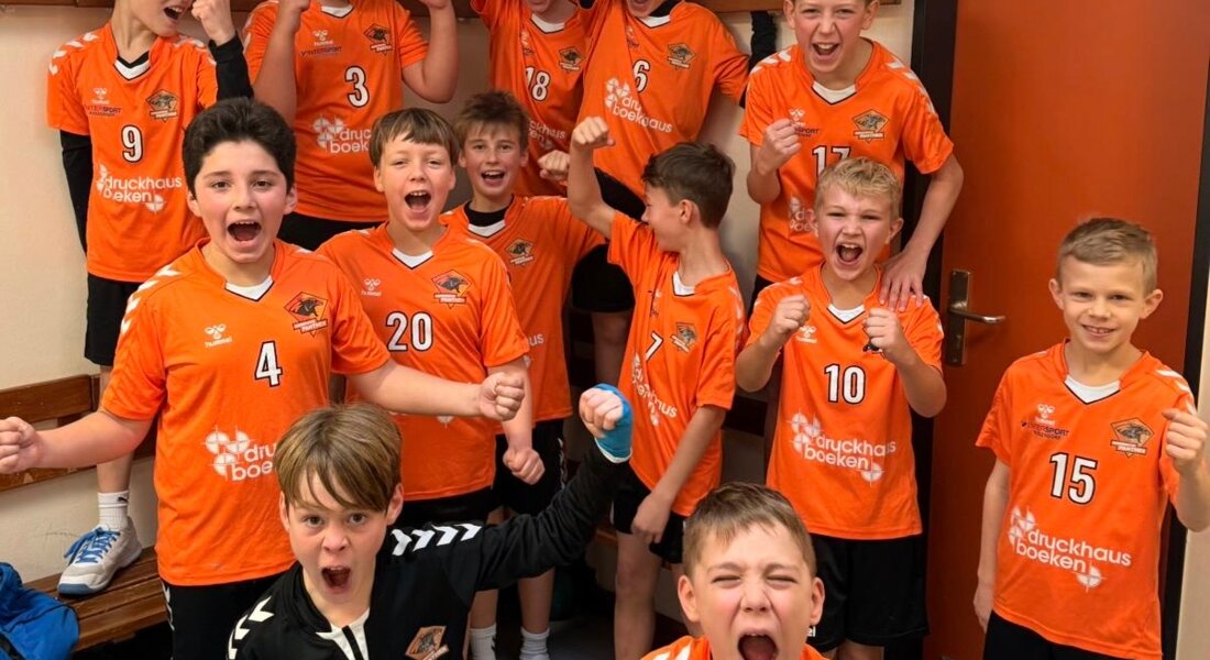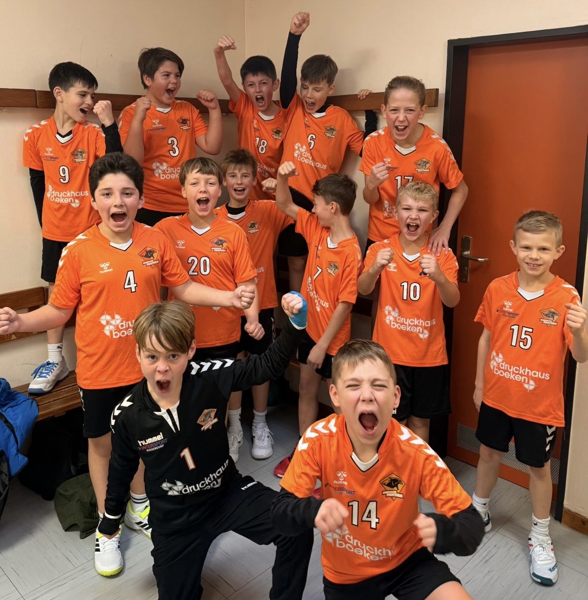 Weiter souverän auf dem Weg in die Bestengruppe und damit im Kampf um die Kreismeisterschaft ist die männliche E1-Jugend (Bild)! Die Mannschaft von Tobi Geske und Niko Nesselrath siegte locker mit 34:18 beim Lüttringhauser TV, bleibt verlustpunkfreier Tabellenführer. Bereits früh stellte man in der einseitigen Partie die Weichen auf Sieg und baute den Vorsprung kontinuierlich bis ins Ziel aus. Phil Geske mit 14 und Luke Nadrowski, sowie Eliah Nesselrath mit je 5 Treffern trafen am besten.