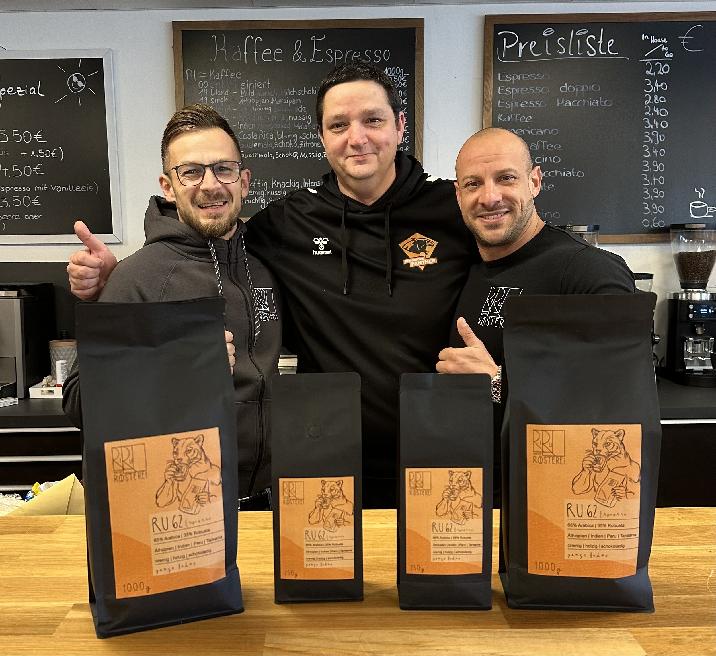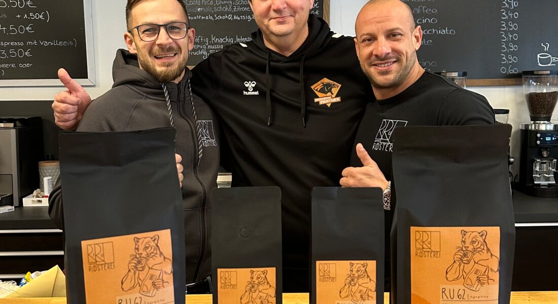 In Zusammenarbeit mit unserem Jugend-Partner Riru Kaffeerösterei gibt es ab sofort eine spezielle Panther Edition. Die ausgesuchte Bohne mit eigenem Etikett in orange wurde im Café in Burscheid von den Geschäftsführern Martin Richter und Maurizio Russo zusammen mit Vorstand Toni Kurz präsentiert. Nachdem bereits seit Saisonbeginn der Riru Kaffee an allen Heimspieltagen der Jugend in verschiedenen Varianten erhältlich ist, gibt es ihn jetzt dort in den Größen 250 Gramm und 1 Kilo auch als Bohne zu erwerben.